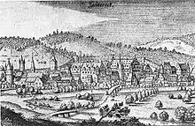 The last named is taken to be the actual "Lauterecken comital line", which characterized the town with the building of two castles, whose appearance is preserved in Matthäus Merian's engraving from about 1650. Thus, from 1543 to 1694, Lauterecken was the residence town of the sideline of Palatinate-Veldenz-Lauterecken. In 1689, however, the town and castles were destroyed. When Count Gerlach I founded the original County of Veldenz, Lauterecken had evidently outstripped the neighbouring village of Medard. Even before 1350 (likely in 1349), Lauterecken had been raised to town. In the latter half of the 14th century, the fortifications sprang up with three gates (Untertor or "Lower Gate", Bergtor or "Mountain Gate", Obertor or "Upper Gate") and five towers, of which three stood near the gravely endangered Lower Gate and two others at corners in the defensive wall (these two can be seen in the Merian engraving). Any attempt by historians to describe a castle integrated into the town fortifications at this early time has come up against considerable difficulties. There can, however, be no doubt that there was a castle complex either within the town or nearby that served a mainly defensive purpose rather than that of simply representing the local lords. In 1384, it was said that the work on the original town fortifications was completed. At the so-called brotherly partition in 1387, Count Friedrich of Veldenz received the town of Lauterecken with its castle and Burgmannen along with a few outlying villages, while Medard passed as a village in the Amt of Odenbach to Count Heinrich. In 1393, Count Friedrich III founded an actual Amt of Lauterecken, which he expanded by adding to the hitherto small region the Ämter of Nerzweiler, Reichenbach and Bosenbach. Belonging to this new Amt were the following places: Albersbach, Aschbach, Bettenhausen, Bosenbach, Eßweiler, Föckelberg, Fockenberg, Gimsbach, Hinzweiler, Hundheim, Jettenbach, Kollweiler, Lauterecken, Limbach, Lohnweiler, Matzenbach, Miesenbach, Mühlbach, Nerzweiler, Neunkirchen am Potzberg, Niedersteegen, Niederstaufenbach, Obermohr, Oberstaufenbach, Obersteegen, Oberweiler im Tal, Reichenbach, Reichenbachstegen, Rothselberg, Rutsweiler am Glan, Schrollbach, Theißberg, Wiesweiler and other places that now no longer exist. In 1444, the County of Veldenz met its end when Count Friedrich III of Veldenz died without a male heir. His daughter Anna wed King Ruprecht's son Count Palatine Stephan. By uniting his own Palatine holdings with the now otherwise heirless County of Veldenz – his wife had inherited the county, but not her father's title – and by redeeming the hitherto pledged County of Zweibrücken, Stephan founded a new County Palatine, as whose comital residence he chose the town of Zweibrücken: the County Palatine Zweibrücken – later a Duchy.[7]