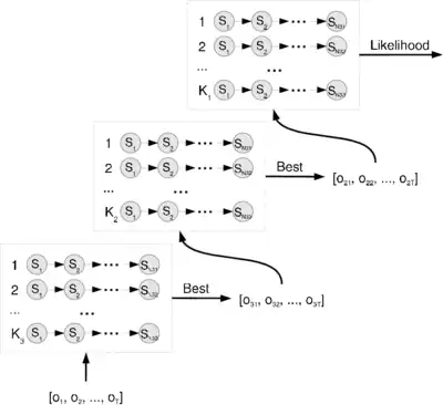 A layered hidden Markov model (LHMM) consists of levels of HMMs where the HMMs on level corresponds to observation symbols or probability generators at level . Every level of the LHMM consists of HMMs running in parallel.