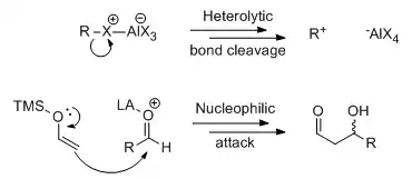 In reactions with polar mechanisms, Lewis acid catalysis often involves binding of the catalyst to Lewis basic heteroatoms and withdrawing electron density, which in turn facilitates heterolytic bond cleavage (in the case of Friedel-Crafts reaction) or directly activates the substrate toward nucleophilic attack (in the case of carbonyl addition reactions). The dichotomy can have important consequences in some reactions, as in the case of Lewis acid-promoted acetal substitution reactions, where the SN1 and SN2 mechanisms shown below may give different stereochemical outcomes. Studying the product ratio in a bicyclic system, Denmark and colleagues showed that both mechanisms could be operative depending on the denticity of the Lewis acid and the identity of the R' group.[3]