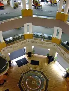 The Library's facade includes rose-colored granite, with large windows facing the street and Phoenix Park. A rotunda in the lobby, the focal point of the building, spans all five floors and houses the world's largest ceiling clock and Foucault pendulum, designed by Lexington sculptor Adalin Wichman.[1] The rotunda also includes a frieze depicting the history of the horse in the Bluegrass. Included within the complex is the 138-seat Farish Theater, meeting rooms and an atrium reading lounge. An art gallery is located on the ground floor.