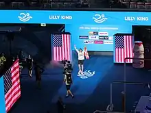 In her first event at the 2019 World Championships, King won the 100-meter breaststroke in a time of 1:04.93. She also won the 50-meter breaststroke easily with a 29.84.[27] In the 200-meter breaststroke, King was disqualified in the prelims heats for not touching the wall simultaneously with both hands on one of her turns.[27][28] King swam the breaststroke leg of the 4x100-meter mixed medley relay with Ryan Murphy swimming backstroke, Caeleb Dressel swimming butterfly, and Simone Manuel swimming freestyle. She was the only female swimmer to swim the breaststroke leg of the mixed relay out of all eight relays in the final. The relay finished second, two-hundredths of a second behind the Australian relay team, taking silver in the event. Lastly, King was a part of the world record-breaking 4x100-meter medley relay with Regan Smith, Kelsi Dahlia, and Simone Manuel in a time of 3:50.40.[27]
