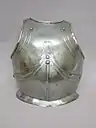 Cuirass | ![]() | 14th to 17th | Covers the chest, not the back, but the name is sometimes used to describe the chest and back plates together. Developed in antiquity but became common in the 14th century with the reintroduction of plate armour, later sometimes two pieces overlapping for top and bottom. Whether of one piece or two, breastplate is sometimes used to literally describe the section that covers the breast. |