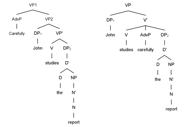 (1) a. John carefully [V studies] [DP the report]. b. *John [V studies] carefully [DP the report].[1]: 192 |