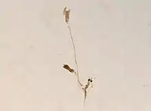 Lovenella gracilis are colonial animals that form erect colonies,[1] on hard surfaces using a hydrorhiza, stem-like structure, and reach a maximum height of around 2.3 mm.[2] The polyp is the dominant stage of the L. gracilis. They are trophosome with thin hydrocaulus that branch out alternatively to form the hydrotheca. At the end of each branch there is a conical operculum that consists of eight pieces. This structure also contains ten to twelve tentacles equipped with nematocysts that can be used in self-defense or to capture their prey.[3]