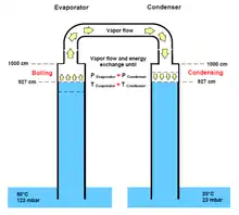 The thermal energy (1) is supplied at the main heat exchanger (HEX 1) by any available media heating up the intake water up to 95°C. In the evaporator cycle (green), the hot water is sprayed and evaporated in pressure reduced chambers (2) and flows by gravity to the subsequent chambers with lowered temperature and pressure environment. The generated vapor (3) flows from the evaporator to the condenser in every stage where it condenses on the cooled droplets of the sprayed distillate.[6]