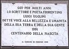 On 11 December 1993 the Commune of Florence affixed a commemorative marble plaque to the Ugolini home in Florence, declaring the house a national monument. The epigraph on the plaque was unveiled during a government dedication ceremony in which some officials wore Renaissance-period clothing styles. In English, the epigraph reads, "Here for many years the Florentine writer and poet Luigi Ugolini gave voice to the beauty and humanity of his land and his people.",[6][7]