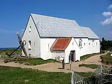 Heavy storms in the late 20th century and early 21st so harmed the coast that one corner of the church was damaged and by the mid-2000s, the sea was just 9 meters (30 ft) from the church. There were heated debates over what to do, whether to let nature take its course, or to take action and try to save the church. Danish firms tried to protect the coast and prevent sand erosion.[9] In August 2007, after four years of discussion, the Danish National Museum, in view of the considerable cost and local public resistance, decided to relocate the church to an open-air museum. At the end of November 2007, the authorities responsible for culture and land protection decided to dismantle the church. In autumn 2008, the roof and interior of the church were removed and put in storage; the walls were left behind.[10] In autumn 2011, the western wall was dismantled, leaving remnants of only three walls with an open view to the sea. In summer and autumn 2012, severe erosion north and south of the site caused large chunks of land to fall into the sea. By November 2012 the church rested a mere nine meters from the steep cliff, and authorities were monitoring the situation in order to determine when it would be necessary to dismantle more of the church. By May 2016 the church had been removed completely, and the anchor moved further inland, away from the eroding cliff edge.