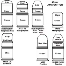 - (M406) high-explosive round. The HE round has an olive drab aluminum skirt with a steel projectile attached, gold markings, and a yellow ogive. It arms between 14 and 27 m (46 and 89 ft), produces a ground burst that causes casualties within a 130 m (430 ft) radius, and has a kill radius of 5 m (16 ft).[10]