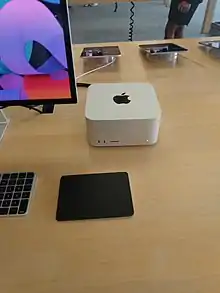 The Mac Studio is a small-form-factor workstation made by Apple Inc. It is one of four desktop computers in the Mac lineup, sitting above the consumer-range Mac Mini and iMac, and positioned below the Mac Pro. It is configurable with either the M2 Max or M2 Ultra system on a chip.[1][2]