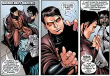 As part of the 2016 Marvel NOW!, Machine Man appeared as an employee of Umbral Dynamics.[47] Machine Man later appears as a member of Domino's incarnation of the Mercs for Money.[48] During the "Iron Man 2020" event, Machine Man appears as a member of the A.I. Army.[49] Machine Man was assigned to blow up the satellite dish on Baintronics only for his feelings towards a reprogrammed Jocasata to get in the way.[50] He followed her to a Baintronics facility and fought through many of the X-series robots that came before him. When he finally catches up to Jocasta, he is taken down by a new X-series robot model named X-52.[51] Despite being at a disadvantage, Machine Man defeated X-52 and killed Jocasta while making off with her still-active head. Though he ran into a Baintronics security personnel as he prepares to fight them.[52]