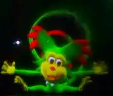 Kiki, a lime green coloured monkey; is the main protagonist of the show. During Mr Whamsey's performance, he interrupts the "usual program" intended and appears laughing hysterically at the audience. He then challenges Mr. Whamsey to a duel over the control of the Sentosa Musical Fountain. Afterwards, he introduces the surprised Mr. Whamsey to several of his friends, namely the mock band "The Fantastic Fish", and other unnamed characters. He then invites Mr. Whamsey to the alternate dimension where he lives. Kiki also acts as a guide to Mr. Whamsey throughout his journey in the alternate dimension. Despite this, the both never appear on the water screen at the same time. When the latter finally returns, he bids Mr. Whamsey and the audience farewell, reminding them that he'll be waiting for them. He then makes his trademark laughter and disappears from the scene.