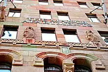 The building has three paired window bays across the Queen Street facade. Three double height arched openings occur at the ground floor level. On the level above are paired window openings with arched heads and a central ornamented column. The two levels below the top floor have paired window bays which are similar but double the height. At the base of these is an imitation balcony with balusters supported on brackets. In this way the building has both a distinctive top and base. A similar projecting balcony occurs in front of the central window bay on the level below. Above the double height bays at the base of the top level sculptured lions stand on projecting brackets. The one facing the corner is winged. The parapet has raised portions each with a projecting stylised eagle "gargoyle". Similar gargoyles appear in the same location a level below and also below each projecting flag post above the third floor.[1]