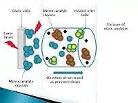 Laserspray inlet ionization (LSII) is a subset of MAII and uses a matrix-assisted laser desorption/ionization (MALDI) method. It was originally called atmospheric pressure matrix-assisted laser desorption/ionization however was renamed as LSII to avoid confusion with MALDI and as it was found to be a type of inlet ionization.[3][5] As all inlet ionization techniques, highly multiply charged ions are produced. A nitrogen laser is used to ablate the solid matrix/analyte into the heated inlet tube, the observed ions are generated at the surface of the matrix/analyte and so the laser is not directly involved in the ionization as was originally thought.[4] LSII can determine protein molecular weights and has been found to detect masses of proteins up to 20,000 Da. The sensitivity of LSII, for protein detection, is higher by an order of magnitude compared to ESI.[6]
