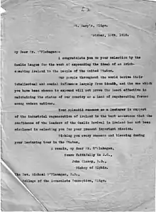- ↑ Hyde, Douglas (3 November 1904). "Letter from Douglas Hyde to Fr Michael O'Flanagan, saying he will be sorry to see him go to America, 3 November 1904". National Library of Ireland. Retrieved 31 January 2019.