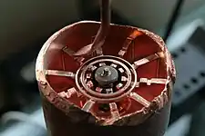 Disassembled radar speed gun. The grey assembly attached to the end of the copper-colored horn antenna is the Gunn diode which generates the microwaves.