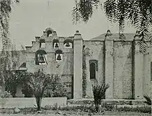 Although San Gabriel once furnished food and supplies to settlements and other missions throughout California, a majority of the Mission structures fell into ruins after it was secularized in November 1834. The once-extensive vineyards were falling to decay, with fences broken down and animals roaming freely through it.[28] During part of the 1850s, squatters set upon the mission, converting part of it into a saloon which had both felons and a justice of the peace as customers;[29] it was opened by former San Diego Mayor Joshua Bean.[30]