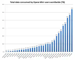 Total data consumed by Opera Mini users worldwide from 2006 to mid-2008 in TB