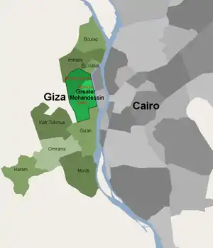 Mohandiseen (Arabic: المهندسين Al-Mohandisīn pronounced [almohændɪˈsiːn], "The Engineers") is a major 1940s sub-division project originally named Madinat al-Awqaf,[1] and made up most of the Wasat (middle) district in the city of Giza, before being divided in 1997 into the districts of Agouza (covers most of the district) and Dokki (Covers half of the district). Al-Mohandessin in Arabic literally means the engineers, after one of the sub-districts that was sold to the Engineers' Syndicate cooperative, and becoming the colloquial name for most of the Agouza side.