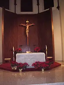 Above the altar (from left to right): Saint Athanasius, Saint Jerome, Saint Augustine, Saint Ambrose, The Holy Trinity (center), Saint Matthew, Saint John the Evangelist, Saint Isidore of Seville, and Saint Thomas Aquinas.