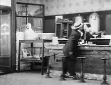 Mr. Flip is a 1909 American silent comedy film made by Essanay Studios, directed by Gilbert M. 'Broncho Billy' Anderson and starring Ben Turpin.[1] The film is about a man going to various locations in town where he flirts with the women, and they in turn get comedic revenge on him, causing him to leave their establishment, and leave them alone. This film is believed to have included the first cinematic instance of a comedian being hit in the face with a pie, later known as the Pie in the Face, when Ben Turpin was struck.[2] However, the pie Turpin was hit with was hand-held, not thrown.[3]