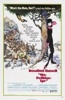 Mrs. Pollifax–Spy is a 1971 American comedy film directed by Leslie H. Martinson, starring Rosalind Russell, Darren McGavin, and Nehemiah Persoff. It was released by United Artists. Russell wrote the screenplay for the film, which she adapted from the novel The Unexpected Mrs. Pollifax by Dorothy Gilman. Russell used the pen name "C. A. McKnight," which was taken from her mother's maiden name.[1][2] It was Russell's last role in a theatrically released film.[3]