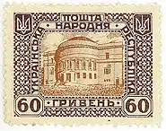 In 1919, the Directorate of Ukraine commissioned him to design postage stamps for the Ukrainian People's Republic. He produced fourteen designs altogether and they were printed in 1921 but, shortly after, the Soviets took control of Ukraine and they were never used.