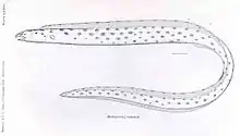 The spotted snake eel (Myrichthys tigrinus), also known as the tiger snake eel or the spotted tiger snake eel,[1] is an eel in the family Ophichthidae (worm/snake eels).[2] It was described by Charles Frédéric Girard in 1859. It is a marine, tropical eel which is known from the eastern central and southeastern Pacific Ocean, including Chile, Costa Rica, Colombia, El Salvador, Ecuador, Mexico, Guatemala, Nicaragua, Panama, Honduras, and Peru.[3] It dwells at a depth range of 0 to 60 metres (0 to 197 ft), and inhabits benthic sediments of mud and sand. Males can reach a maximum total length of 74 centimetres (29 in), but more commonly reach a TL of 60 centimetres (24 in).[2]