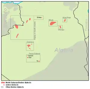 The Mzab–Wargla languages or Northern Saharan oasis dialects are a dialect cluster of the Zenati languages, within the Northern Berber subbranch. They are spoken in scattered oases of Algeria and Morocco.