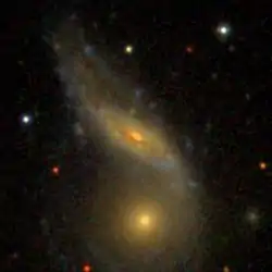 NGC 6040 is a spiral galaxy located about 550 million light-years away[3] in the constellation Hercules.[4] NGC 6040 was discovered by astronomer Édouard Stephan on June 27, 1870.[5] NGC 6040 is interacting with the lenticular galaxy PGC 56942.[6][7] As a result of this interaction, NGC 6040's southern spiral arm has been warped in the direction toward PGC 56942.[2] NGC 6040 and PGC 56942 are both members of the Hercules Cluster.[2][8]