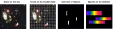 Multi-Object Spectroscopy (MOS) In MOS the total instrument field of view of 3 × 3 arcminutes is covered using 4 arrays of programmable slit masks. These programmable slit masks consist of 250 000 micro shutters where each can individually be programmed to 'open' or 'closed'. The contrast between an 'open' or 'closed' shutter is better than 1:2000.[7] If an object like e.g. a galaxy is placed into an 'open' shutter, the spectra of the light emitted by the object can be dispersed and imaged onto the detector plane. In this mode up to 100 objects can simultaneously be observed and the spectra be measured.