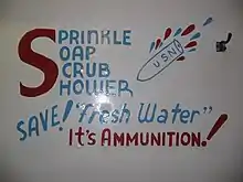 Slogan painted on the wall of a bathroom on the USS Alabama describing a navy shower