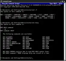 help | Display syntax | No | IBM OS/2 LAN Server, OS/2 Warp 4.5[7] | Windows 95, Windows 98, Windows NT, Windows 2000, Windows XP, Windows Vista, Windows 7, Windows 8, Windows 10[8][3][9] | ReactOS 0.4.8[20] | |