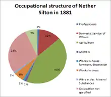 In 1881, 36 out of the 44 males were employed in agriculture,[7] therefore the dominant occupation. During the same period of time, the majority of females occupations are not specified.[7] According to data obtained from the 2001 Census[8] employment was equally divided between extractive and manufacturing industries (agriculture, fishing, hunting, forestry, quarrying, mining, manufacturing, construction, electricity, gas and water supply), and service industries (transport, retail, hotel, catering, property, storage, public administration and defence, finance, communication, education, health and social work). Agriculture is now grouped under manufacturing industries so the number of those employed in agriculture is unknown. But with the area's history of agriculture dominating employment for males[7] it is probable that agriculture is an employer to some extent in Nether Silton. Therefore, when summarising the 2001 census data, it would be correct to say that agriculture no longer dominates employment as it did in 1881, as residents are now moving into jobs within the service sector.[8]