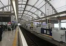 In fiscal 2013, the JR East station was used by an average of 102,817 passengers daily (boarding passengers only), making it the 37th-busiest station operated by JR East.[8] In fiscal 2013, the Keisei station was used by an average of 96,428 passengers per day (exiting and entering passengers), making it the third-busiest station operated by Keisei.[9] Over the same fiscal year, the Toei station was used by an average of 20,421 per day (boarding passengers only), making it the busiest station on the Nippori-Toneri Liner.[10] The daily average passenger figures (boarding passengers only) for the JR East station in previous years are as shown below.