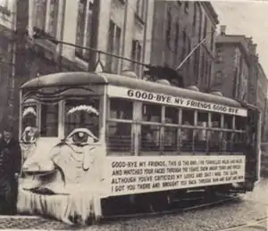 By the conclusion of the war, ridership had more than tripled. Despite the addition of 23 trams, mostly acquired second-hand from other North American cities, the infrastructure was again badly worn and new equipment was in short supply. NSLP made the decision to discontinue rail service and replace the trams with new electric trolleycoaches. The abandonment of streetcar service after 83 years was a sad event for many. On the last day of service, March 26, 1949, NSLP decorated a tram with a tearful face and a goodbye message.[38] Abandoned rails were simply paved over in many cases, and would periodically reappear through broken asphalt until the last were removed in the mid-1990s.