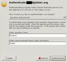 [7] for ejabberd, making it possible to perform man-in-the-middle attacks on OTR users who don't check key fingerprints. OTR developers countered this attack by introducing a socialist millionaire protocol implementation in libotr. Instead of comparing key checksums, knowledge of an arbitrary shared secret can be utilised for which relatively low entropy can be tolerated.[8]