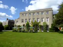 West Ogwell House, the former manor house of West Ogwell, stands next to the church and is a Georgian structure built in 1790 by Pierce Joseph Taylor.[7] In the opinion of Pevsner it has an "overwhelmingly plain exterior (with) no decoration whatever".[8] It incorporates some remains from the former manor house of the Reynell family (whose earliest Devonshire seat was at adjoining East Ogwell),[9] including stables and outbuildings built in 1588 by Thomas Reynell,[10] as the surviving datestone in the wall of the lean-to building in the courtyard attests by its inscription Anno Domini 1588 T. R..[11] In 1943 it became the Convent of the Companions of Jesus the Good Shepherd (founded 1920), and a chapel was added in 1955.[12] In 1996 the Convent moved to Windsor and joined with the Community of St John Baptist,[13][14] and sold West Ogwell to the Gaia House Trust (the then Gaia House being situated at the Old Vicarage in nearby Denbury) whereupon it became the home of a Buddhist centre, which changed the name of the building to "Gaia House", and uses it as "a quiet retreat for meditation and contemplation".[15]