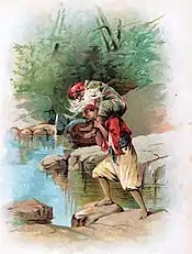 Sinbad the Sailor encountered the monstrous Old Man of the Sea (Arabic: شيخ البحر, romanized: Shaykh al-Bahr) on his fifth voyage. The Old Man of the Sea in the Sinbad tales was said to trick a traveller into letting him ride on his shoulders while the traveller transported him across a stream. However, the Old Man would then not release his grip, forcing his victim to transport him wherever he pleased and allowing his victim little rest. The Old Man's victims all eventually died of this miserable treatment, with the Old Man either eating them or else robbing them. Sinbad, however, after getting the Old Man drunk with wine, was able to shake him off and kill him.[2]