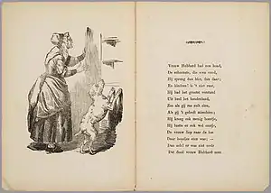 Later came two Dutch translations: In the 1850s, Kluchtige tafereelen van Grootje Goedsloof met haar aardig hondje Blaf (Comical scenes of Granny Goodleaf with her pretty doggy Woof). In that, the Branston illustrations are provided with rhyming captions and the story is told in a more leisurely manner.[29] It was followed in 1860 by Moeder Hubbard en haar hond.[30] Though that keeps more or less to the original story-line, it too is at wordier length. The opening lines, which have no English counterpart, give a fair idea of its discursive style.