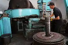 First the olives are ground into an olive paste using large millstones at a corporate oil mill. The olive paste generally stays under the stones for 30–40 minutes. This has three objectives: