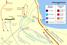 In the centre, the 7th Royal Tank Regiment reached Fort Capuzzo by noon and scattered the defenders, who retreated north to join the 15th Panzer Division, between them and Bardia.[40] Soon afterwards, they faced several counter-attacks by a battalion from the 8th Panzer Regiment of the 15th Panzer Division. After being joined by the 22nd Guards Brigade, they faced the final and largest counter-attack at 18:30 but managed to repulse it.[41] These were not serious assaults, as Rommel would not commit the 15th Panzer Division to battle without more information on the situation. The 8th Panzer Regiment skirmished briefly and then feigned a disorderly retreat to lure Matilda tanks into a chase into range of concealed anti-tank guns. Neither side took much damage from these actions.[42] In response to the British capture of Capuzzo and concerned with a possible attack on Sollum and Bardia, Rommel ordered the 5th Light Division to Sidi Azeiz ready for a possible counter-attack.[43]