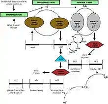 - 1 2 Semchyshyn, Halyna (2009). "Hydrogen peroxide-induced response in E. coli and S. cerevisiae: different stages of the flow of the genetic information". Open Life Sciences. 4 (2): 142–153. doi:10.2478/s11535-009-0005-5.