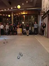 Pétanque (French pronunciation: [petɑ̃k] , ⓘlocally in Provence [peˈtãᵑkə]; Occitan: petanca, [peˈtaŋkɔ] , also ⓘCatalan: [pəˈtaŋkə] or [peˈtaŋka]) is a sport that falls into the category of boules sports (along with raffa, bocce, boule lyonnaise, lawn bowls, crown green bowling). In these sports, players or teams play their boules/balls towards a target ball.[1] In pétanque the objective is to score points by having boules closer to the target than the opponent after all boules have been thrown. This is achieved by throwing or rolling boules closer to the small target ball, officially called a jack[2] (French: cochonnet),[3] or by hitting the opponents' boules away from the target, while standing inside a circle with both feet on the ground. The game is normally and best played on hard dirt or gravel. It can be played in public areas in parks or in dedicated facilities called boulodromes.