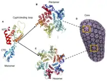 - ↑ Gamble TR, Yoo S, Vajdos FF, von Schwedler UK, Worthylake DK, Wang H, et al. (October 1997). "Structure of the carboxyl-terminal dimerization domain of the HIV-1 capsid protein". Science. 278 (5339): 849–853. Bibcode:1997Sci...278..849G. doi:10.1126/science.278.5339.849. PMID 9346481.