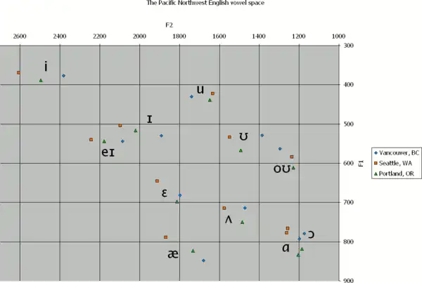 The Pacific Northwest English vowel space. Based on TELSUR data from Labov et al. The /ɑ/ and /ɔ/ are indistinguishable in the F1/F2 means for three speakers from Vancouver, British Columbia, two speakers from Seattle, Washington, and three from Portland, Oregon.