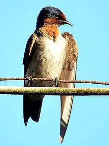 The Pacific swallow (Hirundo tahitica) is a small passerine bird in the swallow family. It breeds in tropical southern Asia and the islands of the south Pacific. It is resident apart from some local seasonal movements. This bird is associated with coasts, but is increasingly spreading to forested uplands.[2] The hill swallow and the welcome swallow were formerly considered conspecific.