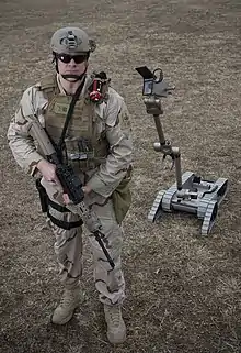 PackBot is a series of military robots by Endeavor Robotics (previously by iRobot[1]), an international robotics company founded in 2016, created from iRobot, that previously produced military robots since 1990. More than 2000 were used in Iraq and Afghanistan.[2] They were also used to aid searching through the debris of the World Trade Center after 9/11 in 2001.[3] Another instance of the PackBot technology being implemented was to the damaged Fukushima nuclear plant after the 2011 Tōhoku earthquake and tsunami where they were the first to assess the site.[4] As of November 2014, the U.S. Army is refurbishing 224 iRobot 510 robots.[5] The PackBot technology is also used in collaboration with NASA for their rovers and probes.