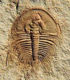 No Precambrian fossils are known from Vermont. Therefore, the state's fossil record does not begin until the Paleozoic. During the Cambrian period the state was covered by a warm shallow sea.[2] This sea was home to ostracoderms and trilobites. One Cambrian ostracoderm left behind fossil remains in Franklin County. The specimen is now housed in the Princeton University geological museum. Olenellus vermontanus was one Vermont trilobite. At the time of its discovery near Georgia Center it was the most primitive known trilobite in the world.[1] Contemporary local marine animals also left behind fossil tracks and trails.[2]