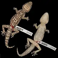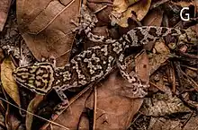 Paroedura manongavato was formerly not recognized as a separate species from the Mocquard's Madagascar ground gecko (Paroedura bastardi), with collected specimens being referred to P. bastardi or P. sp. aff. bastardi in 2021.[2][3] A study in 2023 found that P. manongavato is a distinct species using genetic and morphological data. The holotype specimen was collected on 27 November 2014 and represents an adult female. The specific name is derived from the Malagasy words “manonga” (meaning “to climb”) and “vato” (meaning “rock”).[1]