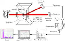A focused laser beam rotates in a constant frequency and interacts with particles within the sample medium. Each randomly scanned particle obscures the laser beam to its dedicated photo diode, which measures the time of obscuration.